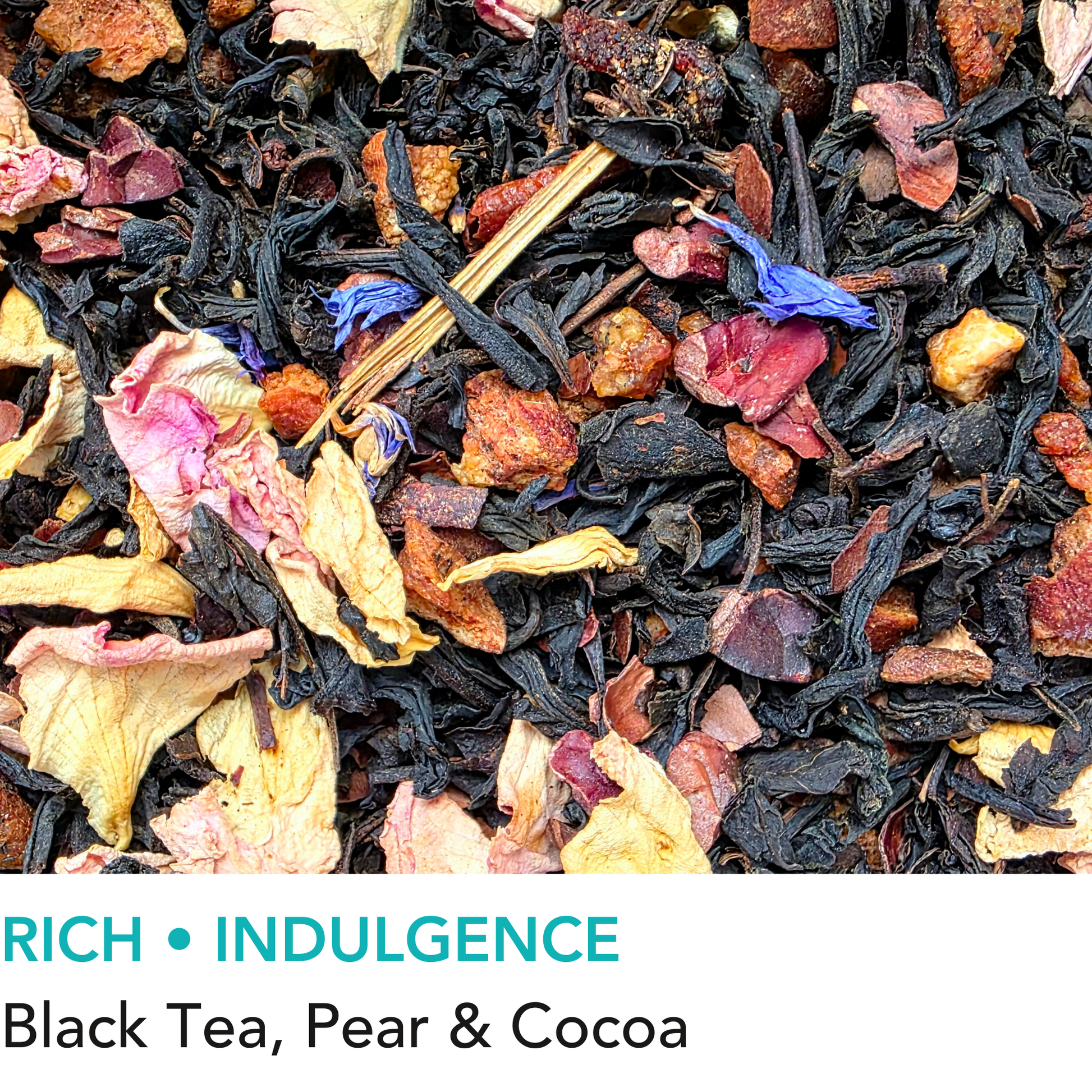 Black tea, pear pieces, cocoa beans, cocoa husks, rose petals, cornflower blossoms. Contains caffeine.