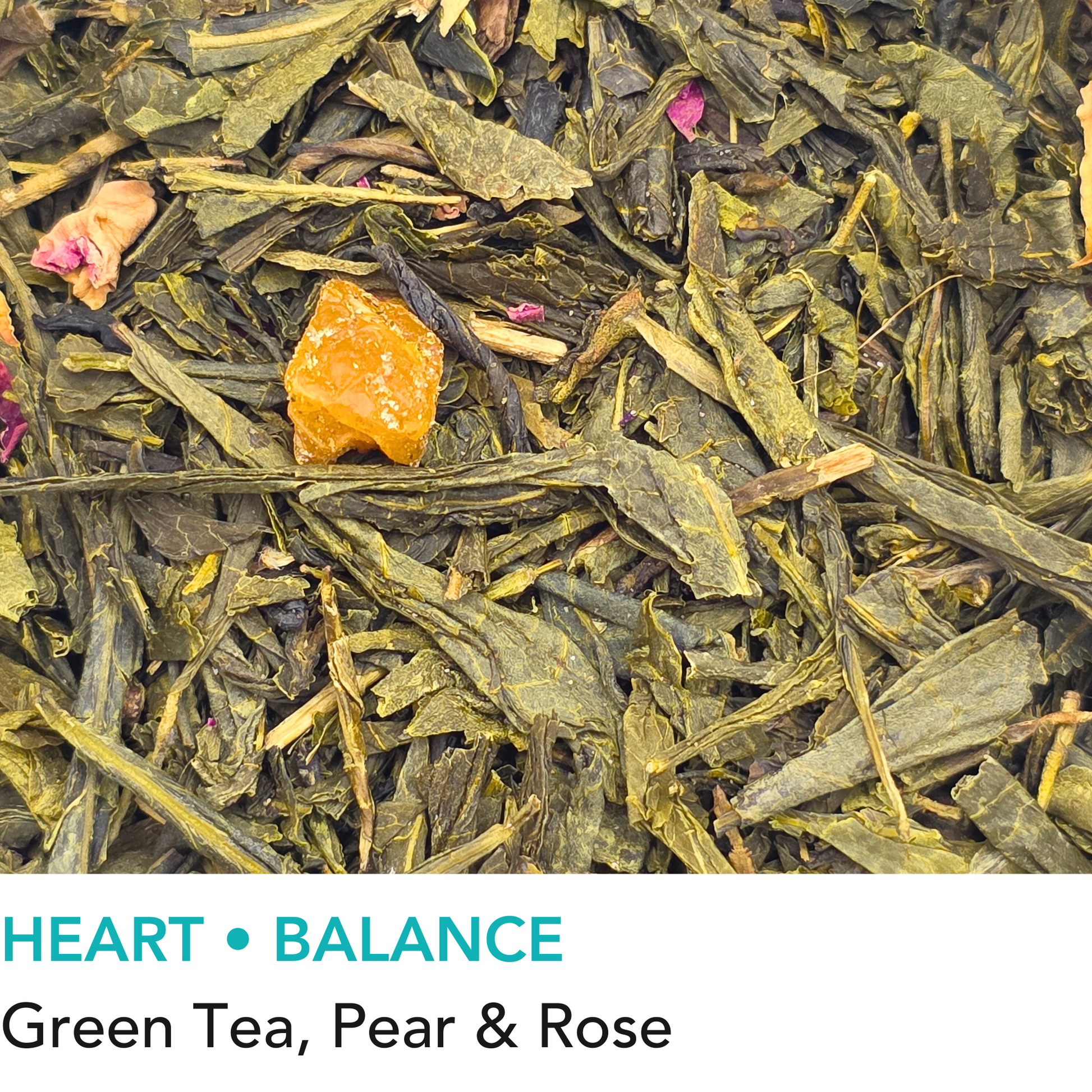 Green tea, pear pieces, rose petals. Contains caffeine.