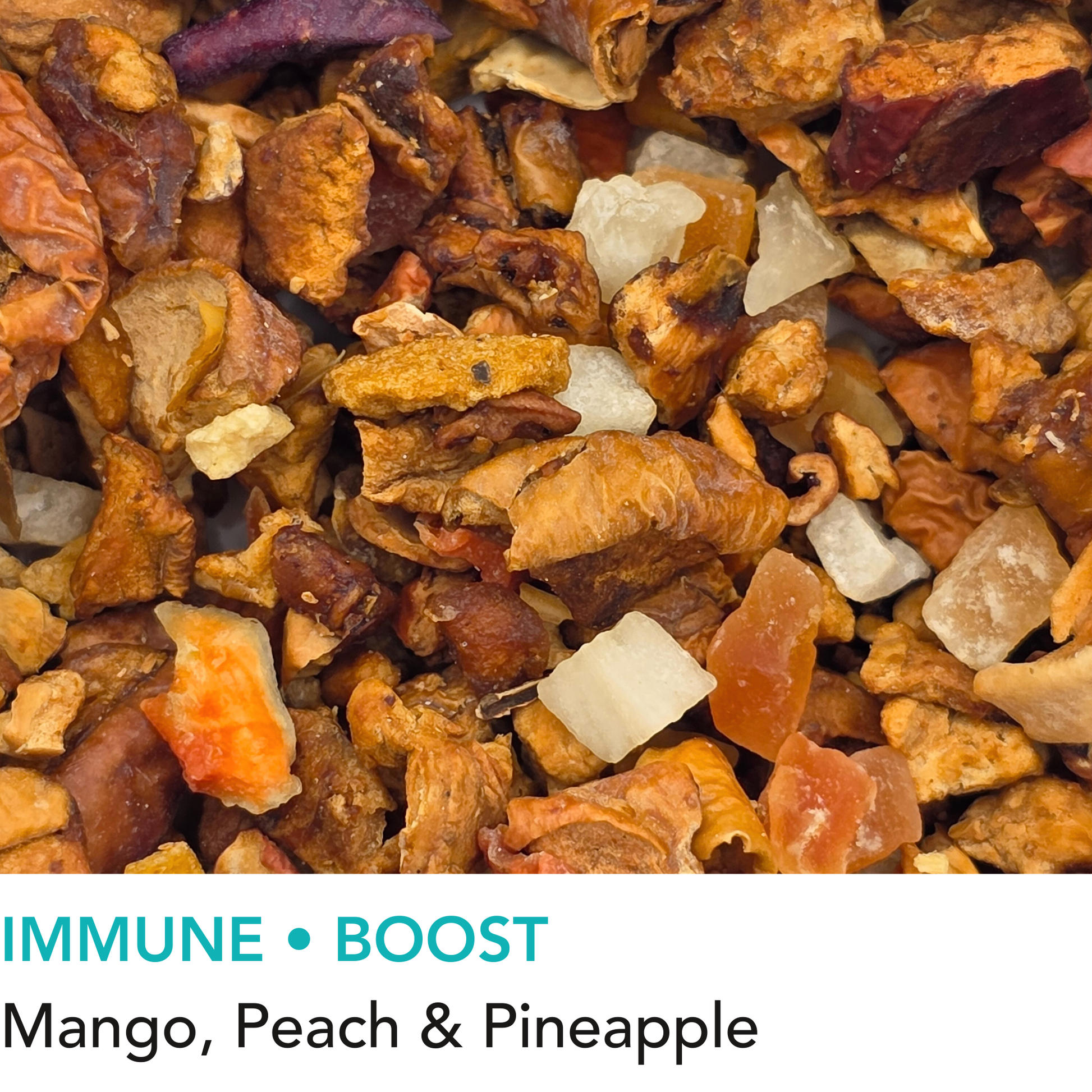 Apple, candied pineapple, candied papaya, peach, carrot flakes, mango. Caffeine free.